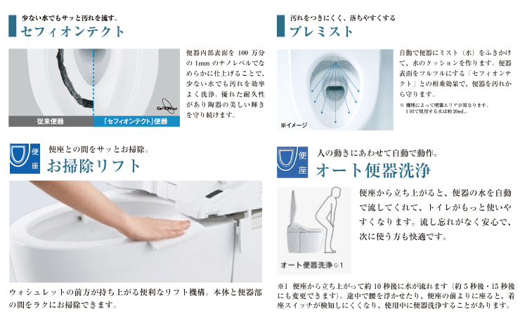 美しい透明感を空間に生み出すアクリル人造大理石製カウンターは、洗面ボウル一体型で、収納力と機能性が際立つホテルライクなSANITARY。自動トイレは進化した超節水&節電機能で、賢くエコロジー。使う人の気持ちに立った思いやりの先進機能で、毎日心地よく快適に。