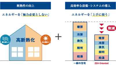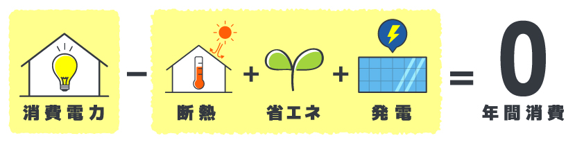 ZEH(net Zero Energy Houseの略)とは、住宅で「消費するエネルギー」と太陽光発電などの設備によって「生み出すエネルギー」を比較して、1年間で消費するエネルギーの量を実質ゼロ以下にした住宅を指します。消費するエネルギーの削減のために住宅の断熱性能を上げたり、高効率な空調設備を入れたりすることは、その効果と同時に快適な住環境を作り出すことにもつながります。経済産業省のエネルギー基本計画では、「2020年までに標準的な新築住宅で、2030年までに新築住宅の平均でZEHを目指す」とされています。