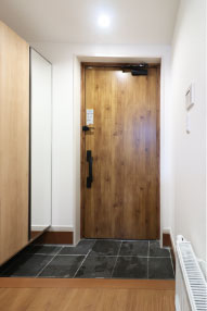 | 玄関扉はノンタッチキーで簡単に開閉可能。玄関タイルを用いて住まいのデザインスタイルを演出しつつ、センサー付きLED照明の光で訪れる人を明るく迎えます。玄関収納にご家族全員の靴を収めて玄関回りをいつでもすっきりと保つことも可能。更に外側に宅配ポストを設置しているので、留守のときでも安心してお荷物を受け取れます。 | ||