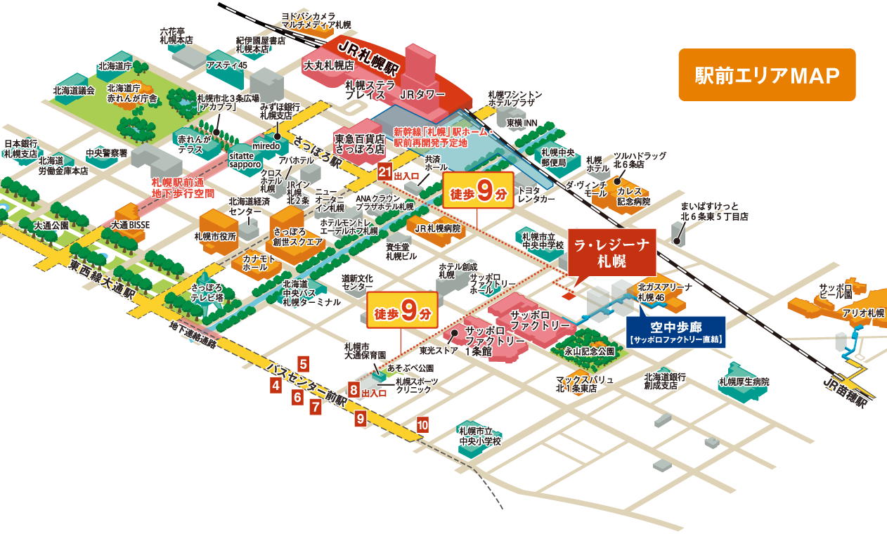 建設地から地下鉄「さっぽろ」駅・「バスセンター前」駅までは徒歩9分。「さっぽろ」駅は地下歩行空間で大通・すすきの方面とつながっており、都心全体へ徒歩でアクセス可能。地下街や大型商業施設も地下鉄・JR直結で、地上に出ずともお出かけを楽しめます。